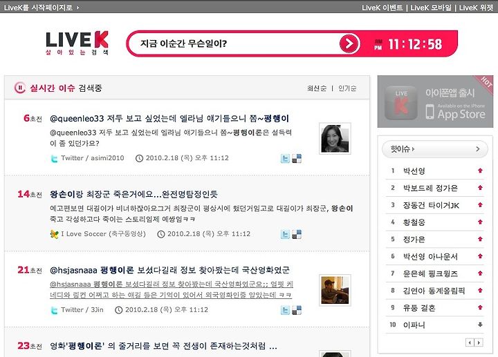 질문은 이제 우리나라에 해봅니다. 과연 우리나라에서 네이버 이상으로 실시간 검색을 필요로 하는 서비스가 필요할까요? 무슨 서비스를 실시간 검색이 필요로 할까요? 미투데이가? 국내에서 트위터가 그렇게 성공할까요? 라이브케이 대표이사님 말로는 몇 국내 웹 사이트가(예:디씨인사이드) 라이브케이의 실시간검색 엔진을 빌려서 사용하는 방식으로 사용해보겠다고 합니다만. 솔직히 그리 쉽지 않는 느낌입니다. 그러기에는 국내의 서비스들이 너무 다양성이 없지 않나라는 느낌입니다.